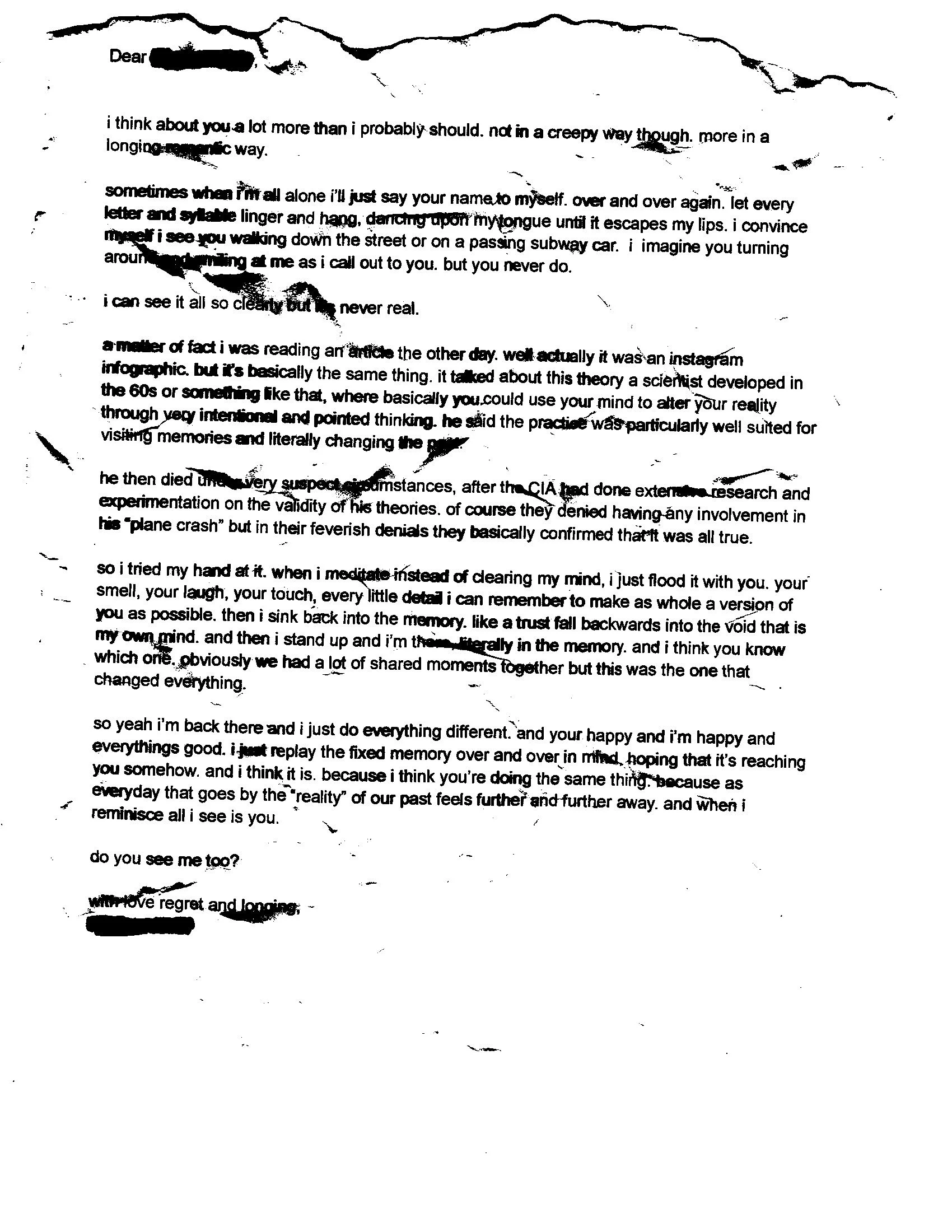 “I interpret the theme as showcasing art's transformative power in achieving self-love and self-understanding. In this vein, Dear Ana is a film about confronting the past, taking ownership of mistakes, and making peace with ghosts. It centers around one ghost in particular, Ana, and depicts the writing and drowning of a love letter addressed to them over the course of a day. The viewer is taken through earnest personal moments of reflection, yearning, regret, and inspiration as they read the contents of the letter on-screen. Various human shades of emotion are displayed, ultimately culminating in acceptance through ritualized destruction and symbolized baptism. The aim of this work, in line with the exhibition’s theme, is to embrace error as sincerely as possible and, in doing so, resolve the past and extend grace to oneself in the present.